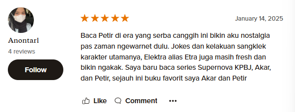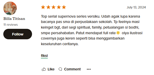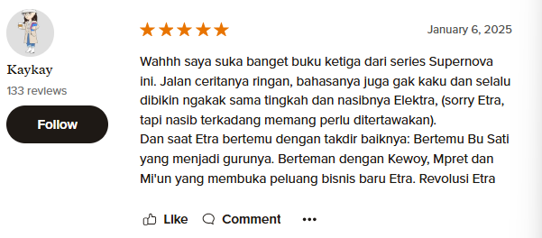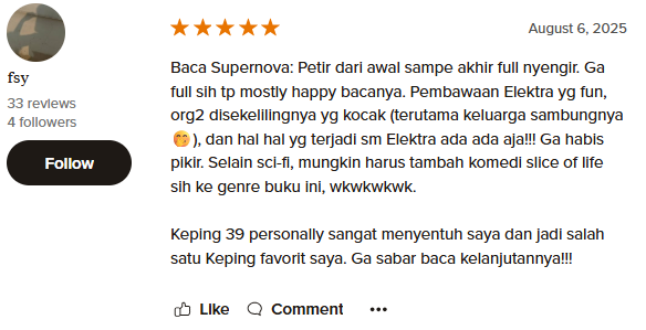 Supernova adalah seri novel karya Dee Lestari yang memadukan sains, filsafat, dan kisah manusia dalam satu semesta besar. Dimulai dari “Kesatria, Putri, dan Bintang Jatuh,” seri yang terdiri dari 6 buku ini tumbuh menjadi perjalanan lintas tokoh yang saling terhubung. Masing-masing mencari makna, cinta, kebenaran, dan kesadaran. Sebuah karya yang mengajak pembacanya berpikir, merasakan, dan menemukan diri di antara luasnya semesta.